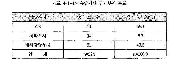 ±¤°íÀÎ Áß¿¡¼ ±¤°í´ëÇà»ç¿¡ ¼Ò¼ÓµÈ »ç¶÷µéÀÇ ±¸Ã¼ÀûÀÎ ´ã´çºÎ¼¸¦ ¾Ë¾Æº¸¸é, ±¤°í¿µ¾÷À» ´ã´çÇÏ´Â ºÎ¼(AE)ÀÇ »ç¶÷µéÀÌ 119(53.1%)¸íÀ¸·Î °¡Àå ¸¹Àº °ÍÀ¸·Î ³ªÅ¸³µ°í ±× ´ÙÀ½À¸·Î ¸ÅüºÎ¼ ´ã´çÀÚ°¡ 91¸í(40.6%)À¸·Î Á¶»çµÇ¾úÀ¸¸ç Á÷Á¢ÀûÀ¸·Î ±¤°íÁ¦ÀÛ¿¡ °ü¿©ÇÏ´Â »ç¶÷µéÀÇ ¼ýÀÚ´Â 14¸í(6.3%)À¸·Î °¡Àå Àû°Ô ³ªÅ¸³µ´Ù.
