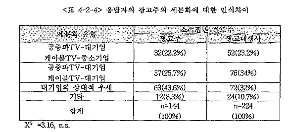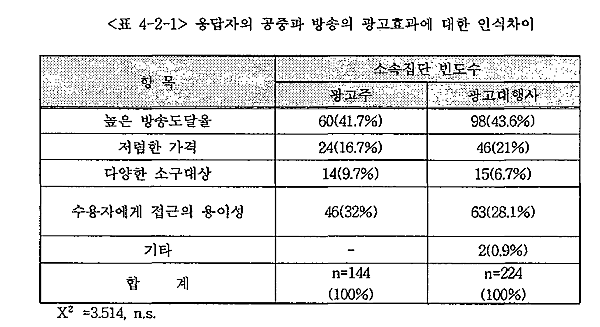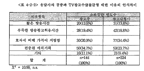 <Ç¥ 4-2-3>Àº TV±¤°í ¼ö±ÞºÒ±ÕÇüÀÇ ÀÌÀ¯¿¡ ´ëÇÑ Áý´Ü°£ Â÷À̸¦ ¾Ë¾Æº¸±â À§ÇØ ±³Â÷ºÐ¼®À» ½Ç½ÃÇÑ °á°ú ¾à°£ÀÇ Â÷À̰¡ ¹ß°ßµÇ¾ú´Ù. ±¤°í´ëÇà»ç¿¡ ¼Ò¼ÓµÈ ÀÀ´äÀÚµéÀº È¿°ú¿¡ ºñÇØ °¡°ÝÀÌ Àú·ÅÇÏ´Ù´Â ÀÌÀ¯¸¦ µç ¹Ý¸é, ±¤°íÁÖ¿¡ ¼Ò¼ÓµÈ ÀÀ´äÀÚµéÀº ÆíÁßµÈ ¸Åü±âȹ¿¡ ¹ß»ýÇÏ´Â ¹®Á¦·Î ÆÇ´ÜÇϰí ÀÖ¾ú´Ù. ±×·¯³ª ÀÌ·¯ÇÑ Áý´Ü°£ÀÇ Â÷ÀÌ´Â Åë°èÀûÀ¸·Î´Â À¯ÀǹÌÇÏÁö´Â ¾Ê¾Ò´Ù.(p=0.052)