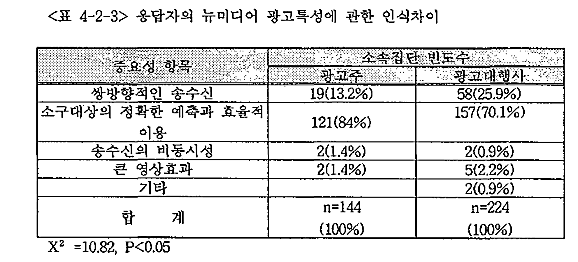±¤°íÀÇ ´º¹Ìµð¾îÀûÀΠƯ¼º Áß¿¡¼ µÎ Áý´ÜÀº ¸ðµÎ ¼Ò±¸´ë»óÀ» Á¤È®È÷ ¿¹ÃøÇÒ ¼ö ÀÖ°í, ¹Ìµð¾î¸¦ È¿À²ÀûÀ¸·Î ÀÌ¿ëÇÒ ¼ö ÀÖ´Ù°í ÇÏ´Â Á¡À» °¡Àå Áß¿äÇÑ °ÍÀ¸·Î ÁöÀûÇÏ¿´´Ù. ¶ÇÇÑ ÀÌ Á¡¿¡´Â Å©°Ô ¹ÌÄ¡Áö ¸øÇÏÁö¸¸ ½Ö¹æÇâÀû ¼Û¼ö½ÅÀ» µÎ ¹øÂ° Áß¿äÇÑ Æ¯¼ºÀ¸·Î ´äÇÏ¿´´Ù. ±×¸®°í Áý´Ü°£ÀÇ Â÷ÀÌ´Â Åë°èÀûÀ¸·Î À¯ÀǹÌÇÏ°Ô ³ªÅ¸³µ´Ù.(p=0.029)