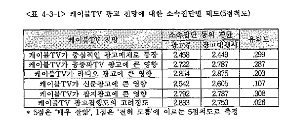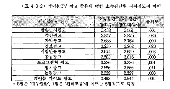 <Ç¥ 4-3-1>Àº ¼Ò¼ÓÁý´Üº°·Î ÄÉÀ̺íTV ±¤°íÀÇ Àü¸Á°ú ±âÁ¸ ¸Åü¿¡ ´ëÇÑ ¿µÇâ·Â¿¡ ´ëÇÑ Æò°¡ÀÇ µ¿ÀÇÁ¤µµ¸¦ ÀÀ´äÇÑ °á°úÇ¥ÀÌ´Ù. ¿©±â¼´Â 1Á¡ÀÌ ¸Å¿ì ¹Ý´ëÀ̸ç 5Á¡ÀÌ Àû±Øµ¿ÀǶó´Â Á¡¼ö±âÁØÀ¸·Î »çÁ¤ÇÏ¿´´Ù. Àü¹ÝÀûÀ¸·Î ¸ðµç Ç׸ñ¿¡ °ÉÃÄ 3Á¡ ¹Ì¸¸À¸·Î ´ëºÎºÐÀÇ ÀÀ´äÀÌ ºÎÁ¤ÀûÀÎ °ÍÀ» ¾Ë ¼ö ÀÖ´Ù. ±¸Ã¼ÀûÀ¸·Î ÄÉÀ̺íTV°¡ ±¤°íÀÇ Áß½ÉÀû ¸Åü·Î ¹ßÀüÇÒ Àü¸Á¿¡ ´ëÇØ ±¤°íÁÖ´Â 2.458Á¡,±¤°í´ëÇà»ç´Â 2.449Á¡À¸·Î °ÅÀÇ µ¿ÀÏÇÑ Æò±Õ°ªÀ» º¸¿´À¸¸ç ÄÉÀ̺íTV ±¤°íÀÇ ±âÁ¸ ¸Åü¿¡ ´ëÇÑ ¿µÇâµµ °ÅÀÇ ¹Ì¾àÇÑ °ÍÀ¸·Î ³ªÅ¸³µ´Âµ¥, ÇѰ¡Áö Àç¹ÌÀÖ´Â »ç½ÇÀº 4´ë ¸ÅüÁß ¶óµð¿À¿¡ °¡Àå Å« ¿µÇâÀ» ¹ÌÄ¥ °ÍÀ̶ó°í Àü¸ÁÇϰí ÀÖ´Â °ÍÀÌ´Ù.