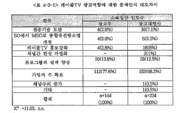 À§ÀÇ °á°ú¸¦ º¸¸é ÄÉÀ̺íTV°¡ ±¤°í¸Åü·Î Á¦ ¿ªÇÒÀ» ¼öÇàÇϱâ À§Çؼ °¡Àå ½Ã±ÞÈ÷ ÇØ°áÇØ¾ß ÇÒ ¹®Á¦°¡ ¹«¾ùÀ̶ó°í »ý°¢Çϴ°¡¿¡ ´ëÇÑ Áú¹®¿¡ ÀÖ¾î¼ ±¤°íÁÖ¿Í ±¤°í´ëÇà»ç ¼Ò¼Ó Áý´ÜÀÇ »ç¶÷µé ¸ðµå°¡ ÄÉÀ̺íTVÀÇ °¡ÀÔÀÚ¼ö°¡ È®º¸µÇ¾î¾ß ÇÑ´Ù´Â Á¡À» ¾ÐµµÀûÀ¸·Î ÁöÀûÇϰí ÀÖ´Ù. ±×¸®°í µÎ ¹øÂ°·Î ÄÉÀ̺íTV ÇÁ·Î±×·¥ÀÇ ÁúÀû Çâ»ó¿¡ ´ëÇÑ ¹®Á¦¸¦ Á¦±âÇÏ¿´´Ù. ½Ç»ó ÀÌ µÎ °¡Áö »çÇ×Àº ¼·Î º¸¿ÏÀûÀÎ ¹®Á¦·Î ÄÉÀ̺íTV°¡ ±¤°í¸ÅüÀû Ư¼ºÀ» ¹ßÈÖÇϱâ À§Çؼ º¸±Þ·ü È®´ë¸¦ À§ÇØ ÇÁ·Î±×·¥ÀÇ ÁúÀû Çâ»ó¿¡ ÁÖ·ÂÇØ¾ß ÇÔÀ» ÀǹÌÇϰí ÀÖ´Ù. ÇÏÁö¸¸ ÁÖµö´Ü°£ÀÇ Â÷ÀÌ´Â Á¸ÀçÇÏÁö ¾Ê´Â °ÍÀ¸·Î ³ªÅ¸³µ´Ù.