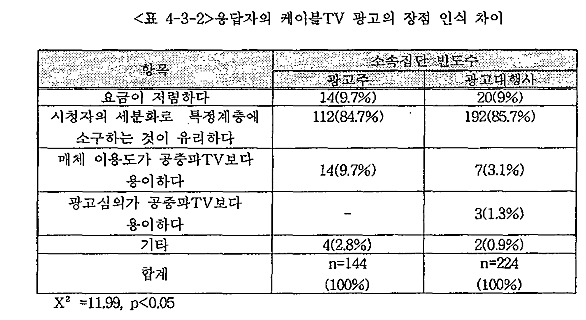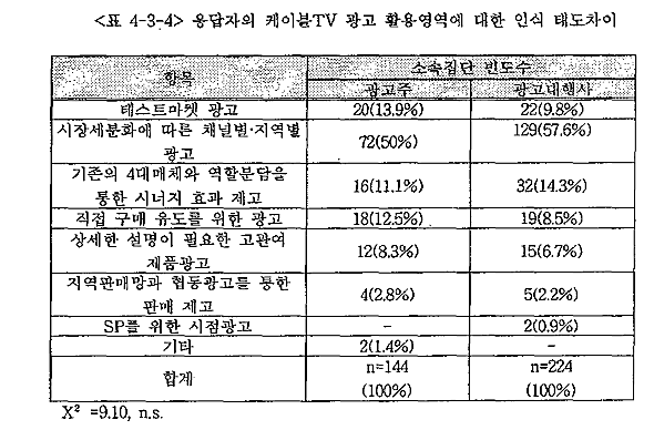 À§ÀÇ °á°ú·Î ¹Ì·ç¾î º¸¾Æ ±¤°íÀεéÀÌ ÄÉÀ̺íTV ±¤°í¸¦ °¡Àå È¿°úÀûÀ¸·Î Ȱ¿ë µÉ ¼ö ÀÖ´Â ¿µ¿ªÀ¸·Î ±¤°í´ëÇà»ç Á¾»çÀÚµéÀº ¹«¾ùº¸´Ùµµ ½ÃÀå¼¼ºÐÈ¿¡ µû¸¥ ä³Îº°¡¤Áö¿ªº° ±¤°í¶ó´Â »ç½ÇÀÌ µå·¯³µ´Ù. ÄÉÀ̺íTV ±¤°í¸¦ ±âÁ¸ÀÇ 4´ë¸Åü¿Í ¿ªÇÒ ºÐ´ãÀ» ÅëÇÑ ½Ã³ÊÁöÈ¿°ú¸¦ Á¦°íÇÒ ¼ö ÀÖ´Ù´Â Ç׸ñÀ» µÎ ¹øÂ°·Î ÁöÀûÇÏ¿´´Ù. ¹Ý¸é¿¡ ±¤°íÁÖÃø¿¡ Á¾»çÇÏ´Â ±¤°íÀεéÀº ÄÉÀ̺íTV¸¦ Å×½ºÆ®¸¶ÄÏ ±¤°í·Î Ȱ¿ëÇÏ´Â °ÍÀÌ ÁÁ´Ù´Â Ç׸ñÀ» µÎ ¹øÂ°·Î µé¾ú´Ù. ³ª¸ÓÁö Ç׸ñµéÀÇ ºÐÆ÷´Â ¾çÁý´Ü¿¡¼ °ÅÀÇ ºñ½ÁÇÏ°Ô ³ªÅ¸³µ´Ù. ±×·¯³ª °¢ Áý´Ü°£¿¡´Â ÀÎÁöÀÇ Åë°èÀû Â÷À̰¡ ³ªÅ¸³ªÁö ¾Ê¾Ò´Ù.(p=0.245)