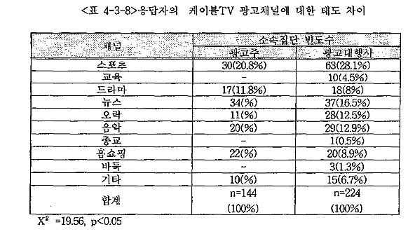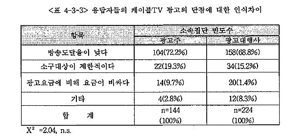 ÄÉÀ̺íTV ±¤°íÀÇ °¡Àå Å« ´ÜÁ¡À¸·Î ±¤°íÁÖ(104¸í)¿Í °ø°í´ëÇà»ç(158¸í) ¼Ò¼Ó Áý´ÜµéÀº ¸ðµå ³·Àº ¹æ¼Ûµµ´ÞÀ²À̶ó°í ÀνÄÇϰí ÀÖ´Â °ÍÀ¸·Î ³ªÅ¸³µ´Ù. ±× ´ÙÀ½À¸·Î ±¤°íÁÖ(22¸í), ±¤°í´ëÇà»ç(34¸í)ÀÇ Á¾»çÀÚµéÀº ¼Ò±¸´ë»óÀÌ Á¦ÇÑÀûÀÌ´Ù¶ó´Â Ç׸ñÀº ¶Ç ´Ù¸¥ ´ÜÁ¡À¸·Î ¿©±â°í ÀÖ´Â °ÍÀ¸·Î Á¶»çµÇ¾ú´Ù. ±¤°íÁÖ ¼Ò¼ÓÁý´Ü°ú ±¤°í´ëÇà»çÀÇ ¼Ò¼ÓÁý´Ü °£¿¡ ºóµµ¼ö¿¡ ´ëÇÑ Åë°èÀûÀ¸·Î À¯ÀǹÌÇÑ Â÷ÀÌ´Â º¸ÀÌÁö ¾Ê¾Ò´Ù.(p=0.729)