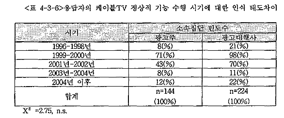 ÄÉÀ̺íTV°¡ ±¤°í¸Åü·Î¼ Á¤»óÀûÀÎ ±â´ÉÀ» ¼öÇàÇÒ ¼ö ÀÖ´Â ½Ã±â¿¡ ´ëÇØ µÎ Áý´ÜÀº ¸ðµÎ 1999-2000À¸·Î ¿¹»óÇϰí ÀÖ´Ù. ±× ´ÙÀ½Àº 2001-2001³âÀ¸·Î ³ªÅ¸³µÀ¸¸ç, ¼¼ ¹øÂ°´Â 2003³â ÀÌÈİ¡ Â÷ÁöÇÏ¿´´Ù. ÀÌ·± °á°ú¸¦ µÎ°í Æò°¡ÇÒ ¶§, 2000³âÀ» ÀüÈÄÇÏ¿© ÄÉÀ̺íTV°¡ Á¤»óÀûÀÎ ±¤°í±â´ÉÀ» ¼öÇàÇÒ °ÍÀ¸·Î Àü¸ÁµÈ´Ù. ±×·¯³ª Áý´Ü°£ ¿¹»óÂ÷ÀÌ´Â Åë°èÀûÀ¸·Î ¾Æ¹«·± Â÷À̰¡ ¾ø¾ú´Ù.(p=0.739)