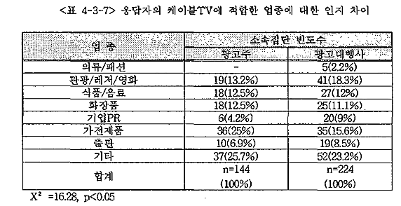 ÄÉÀ̺íTV ±¤°í¿¡ ¾î¶°ÇÑ ¾÷Á¾ÀÌ ¾Ë¸ÂÀº °ÍÀΰ¡¿¡ ´ëÇÑ Áú¹®¿¡ ´ëÇØ ÀÀ´äÀÚµéÀº ºñ±³Àû ´Ù¾çÇÑ ºóµµ¸¦ º¸¿©ÁÖ¾ú´Ù. ±âŸ ºÎºÐ¿¡¼ °¡Àå ¸¹Àº ÀÀ´äÀÌ ³ª¿ÔÀ¸³ª Áý´Ü°£ÀÇ Â÷À̰¡ ´Ù¼Ò ÀÖÀ½ÀÌ ¹ß°ßµÇ¾ú´Ù. Áï ±¤°í´ëÇà»ç Á¾»çÀÚµéÀº °ü±¤(·¹Àú) ¿µÈ µî ¼ºñ½º¾÷Á¾À» µÎ ¹øÂ°·Î ÁöÀûÇÏ¿´À¸³ª, ±¤°íÁÖ Á¾»çÀڵ鿡°Ô À־ °¡ÀüÁ¦Ç°À¸·Î µå·¯³µ´Ù. ±×¸®°í ÀÌ °°Àº Áý´Ü°£ Â÷ÀÌ´Â Åë°èÀûÀ¸·Î À¯ÀǹÌÇÏ¿´´Ù.(p=0.0238)