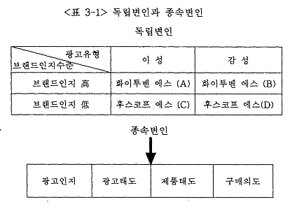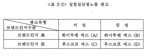 º» ¿¬±¸´Â ÀǾàǰ±¤°í°¡ ºê·£µåÀÎÁö¼öÁØ¿¡ µû¶ó ¾î´À ±¤°í¼Ò±¸À¯ÇüÀÌ ´õ È¿°úÀûÀΰ¡¸¦ ½ÇÁõÀûÀ¸·Î °íÂûÇϰíÀÚ ÇÑ´Ù. µû¶ó¼ ºê·£µåÀÎÁö¼öÁØ(°í/Àú)°ú ±¤°í¼Ò±¸À¯Çü(À̼º¼Ò±¸±¤°í/°¨¼º¼Ò±¸±¤°í)ÀÇ 2°³ ¿äÀο¡ µû¶ó ´ÙÀ½°ú °°ÀÌ 2¡¿2 ¿äÀμ³°è¸¦ ÇÑ´Ù. Áï <Ç¥3-1>¿¡ Á¦½ÃµÈ ¹Ù¿Í °°ÀÌ µ¶¸³º¯ÀÎÀ¸·Î´Â ºê·£µå ÀÎÁö¼öÁØÀÌ ³ôÀº Á¦Ç°ÀÇ À̼º¼Ò±¸±¤°í, ºê·£µå ÀÎÁö¼öÁØÀÌ ³ôÀº Á¦Ç°ÀÇ °¨¼º¼Ò±¸±¤°í, ºê·£µå ÀÎÁö¼öÁØÀÌ ³·Àº Á¦Ç°ÀÇ À̼º¼Ò±¸±¤°í, ºê·£µå ÀÎÁö¼öÁØÀÌ ³·Àº Á¦Ç°ÀÇ °¨¼º¼Ò±¸±¤°í·Î Çϰí Á¾¼Óº¯ÀÎÀº ±¤°íÀÎÁö, ±¤°íŵµ, Á¦Ç°Åµµ, ±¸¸ÅÀǵµ·Î ±¸ºÐÇÏ¿© ±× Â÷À̸¦ ºÐ¼® °ËÁõÇÒ ¼ö ÀÖµµ·Ï ½ÇÇèÀ» ¼³°èÇÑ´Ù.