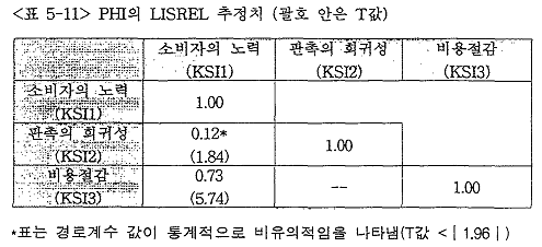 ÇÑÆí °¡¼³ 8Àº ¼ÒºñÀÚÀÇ ³ë·ÂÁ¤µµ¿Í ¼ÒºñÀÚ°¡ ÀÎÁöÇÏ´Â ºñ¿ëÀý°¨°£ÀÇ °ü°è¿¡ °üÇÑ °ÍÀε¥ µÎ º¯¼ö°£ÀÇ °ü°è¿¡ °üÇÑ LISRELÃßÁ¤Ä¡¸¦ »ìÆìº¸¸é ¼ÒºñÀÚÀÇ ³ë·ÂÁ¤µµ´Â ¼ÒºñÀÚ°¡ ÀÎÁöÇÏ´Â ºñ¿ëÀý°¨¿¡ Á¤ÀÇ ¿µÇâ(¥Õ31 = 0.73)À» °¡Ä¡´Â °ÍÀ¸·Î ³ªÅ¸³µ°í T°ªµµ 5.74·Î À¯ÀÇÀûÀÎ °ÍÀ¸·Î ³ªÅ¸³ª ¼ÒºñÀÚÀÇ ³ë·ÂÁ¤µµ´Â ¼ÒºñÀÚÀÇ ºñ¿ëÀý°¨¿¡ Á÷Á¢ÀûÀÌ°í ±àÁ¤ÀûÀÎ »ó°ü°ü°è°¡ Á¸ÀçÇÒ °ÍÀÌ´Ù¶ó´Â °¡¼³ 8Àº ÁöÁöµÇ¾ú´Ù.