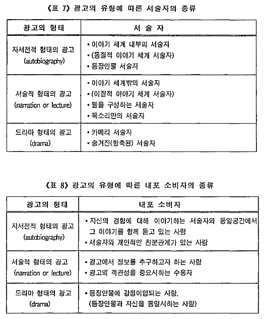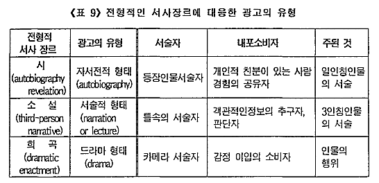 ÀϹÝÀûÀ¸·Î ÀüÇüÀûÀÎ(typical) ¼»ç¹°·Î ¿©°ÜÁö´Â 3°³ÀÇ °Å´ëÀ帣´Â ºñÀüÇüÀûÀÎ ¼»ç¹°ÀÎ ±¤°í ÅØ½ºÆ®¿¡ ±×´ë·Î Àû¿ëµÉ ¼ö ÀÖ´Ù. ½Ã³ª ¼Ò¼³, Èñ°î µîÀÇ ¼»çÀû ¿ä¼Ò(ÅØ½ºÆ® ³»ºÎÀÇ ¼¼úÀÚ¿Í ±â´ëµÇ´Â ³»Æ÷ µ¶ÀÚ, ½ÃÁ¡ µî)ÀÇ À¯Çü¿¡ ¸ÂÃß¾î Àû¿ëÇØ º¸¸é, ¨ç ÀÚ¼Àü(autobiography)Àû ÇüÅÂÀÇ ±¤°í, ¨è °ÀÇ ¶Ç´Â ¼¼ú(lecture or narrative)Àû ÇüÅÂÀÇ ±¤°í, ¨é µå¶ó¸¶(drama) ÇüÅÂÀÇ ±¤°í·Î ³ª´ ¼ö ÀÖ´Ù.