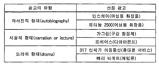 ÀÌ¿¡ µû¶ó, º»°í¿¡¼´Â 1997³â 7¿ùºÎÅÍ 1997³â 9È»µ¿¾È ¹æ¿µµÈ ÅÚ·¹ºñÀü ±¤°í Áß, ¼»çÀû Çü½ÄÀ» ¶è ±¤°í¸¦ ´ë»óÀ¸·Î ¾Õ¿¡¼ ¹àÈù ¼¼°¡Áö ±¤°íÀÇ À¯Çü¿¡ µû¶ó 6°³ÀÇ »ç·Ê±¤°í¸¦ ´ÙÀ½°ú °°ÀÌ ¼±Á¤ÇÏ¿´´Ù.