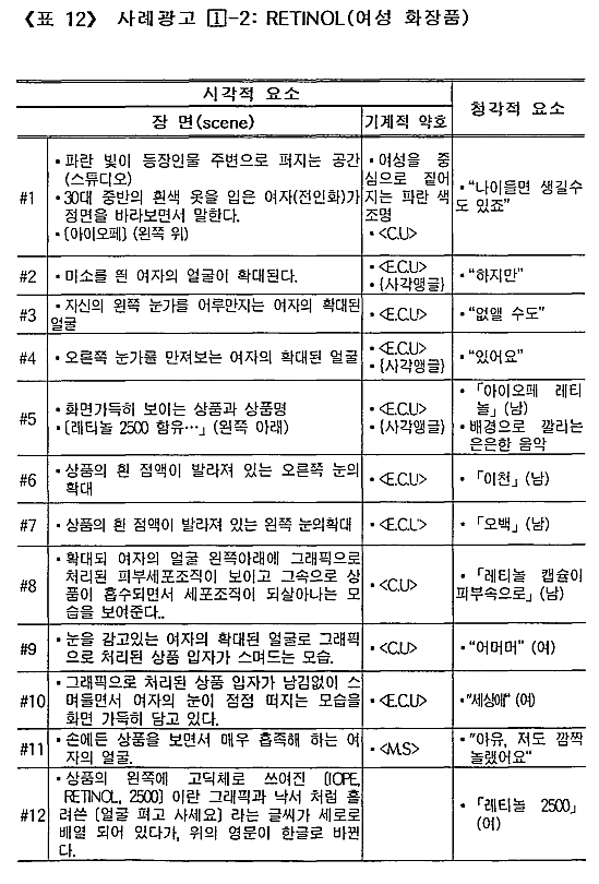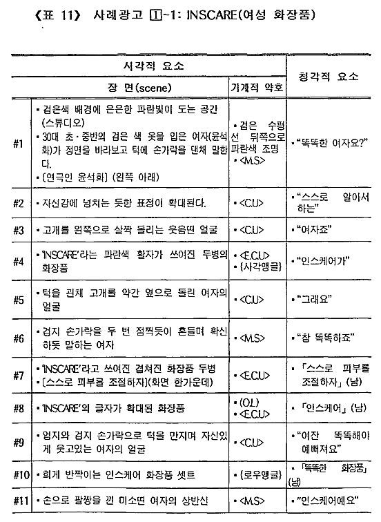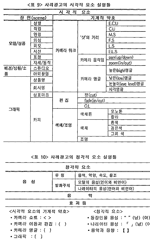 º»°í¿¡¼´Â ¼±Á¤µÈ »ç·Ê±¤°í´Â ¸Å¿ì ªÀº ½Ã°£¿¡ Àü°³µÇ´Â ÅÚ·¹ºñÀü ±¤°íÀÇ ¸ÅüÀû Ư¼ºÀ» °í·ÁÇÏ¿© ¼¦(shot)À» ±âº» ºÐ¼®´ÜÀ§·Î »ï¾Ò´Ù. ÅÚ·¹ºñÀü ±¤°í ÅØ½ºÆ®ÀÇ Àüü ³»¿ë°ú Ç¥Çö¹æ½ÄÀ» º¸±â À§ÇØ Å©°Ô '½Ã°¢Àû ¿ä¼Ò'¿Í 'û°¢Àû ¿ä¼Ò'·Î ³ª´©°í, '½Ã°¢Àû ¿ä¼Ò'¿¡´Â ¿µ»ó°ú ¹®ÀÚ¾ð¾î¸¦, 'û°¢Àû ¿ä¼Ò'¿¡´Â À½¾Ç°ú À½Çâ, ±¸µÎ¾ð¾îÀÇ À½¼ºÀ» Æ÷ÇÔ½ÃÄ×´Ù. ±¸Ã¼ÀûÀ¸·Î ½Ã°¢Àû ¿ä¼Ò¿¡´Â ¸ðµ¨/»óǰ, ¹è°æ/¼Òǰ, ±×·¡ÇÈÀ» Àå¸éÀ» ¼³¸íÇϱâ À§ÇØ ³ª´©¾ú°í, ±â°èÀû ¾àÈ£·Î ¹ÌÀö¼¾74)¿¡ ¼ÓÇÏ´Â ¼¦ÀÇ °Å¸®, Ä«¸Þ¶ó ¿òÁ÷ÀÓ, ¾Þ±Û µîÀ», ¸ùŸÁê75)¿¡ ¼ÓÇÏ´Â ÆíÁý°ú, »öÃ¤Åæ, Á¶¸í µîÀ» º¸¾Ò´Ù. û°¢Àû ¿ä¼Ò¿¡´Â ¸ðµ¨, ³ª·¹ÀÌÅÍÀÇ ¾ð¾îÀû/ºñ¾ð¾îÀû À½¼º°ú È¿°úÀ½Çâ, À½¾Ç µîÀ» ºÐ¼®ÇÏ¿´´Ù.