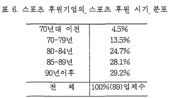 À§ÀÇ Ç¥Àº ½ºÆ÷Ã÷ ÈÄ¿øÀÇ ½Ã±âÀε¥ ´ëºÎºÐÀÇ ±â¾÷µéÀÌ 80³â´ë µé¾î¿Í¼ ½ºÆ÷Ã÷ ÈÄ¿øÀ» ½ÃÀÛÇÏ¿´À¸¸ç 90³â´ë¿¡ ½ÃÀÛÇÑ ±â¾÷µµ °ÅÀÇ 30%¿¡ À̸¥´Ù.