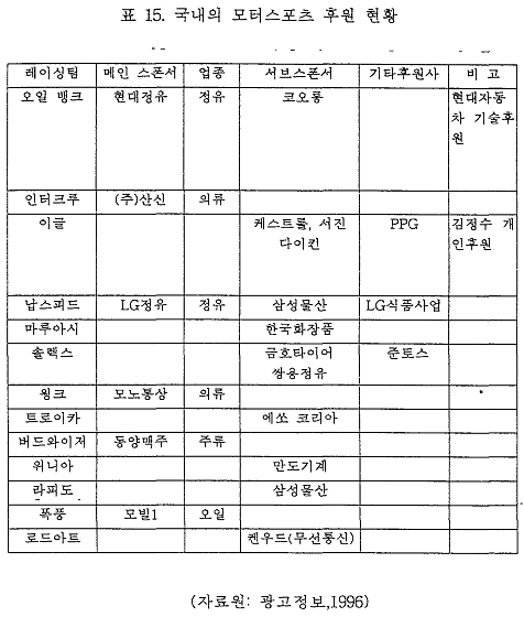 ¿äÁò ±¹Á¦ÀûÀÎ ±â¾÷ÀÇ °æ¿µÁøµéÀº ¸ðÅÍ ½ºÆ÷Ã÷ÀÇ ¸¶ÄÉÆÃ È¿°ú¸¦ ¼ø¼öÈ÷ ÀÎÁ¤ÇÑ´Ù. ´ë±â¾÷ÀÌ ¸¶ÄÉÆÃÀÇ Àü·«ÀÇ ÀÏȯÀ¸·Î¼ ¸ðÅÍ ½ºÆ÷Ã÷¸¦ ¼±ÅÃÇÏ´Â °ÍÀ» º¸¾Æµµ ¾Ë¼ö ÀÖ´Ù. 97³â ÇϹݱⲲ´Â ½ºÆ©¾îµå ±×¶ûÇÁ¸® ÆÀÀÌ ·¼¸®¿¡ Âü°¡¸¦ Çϴµ¥ È«Äá-»óÇÏÀÌ ÀºÇàÀº ÀÌ ÆÀ¿¡°Ô 5³â¿¡ °ÉÃÄ2õ500¸¸ ÆÄ¿îµå (¾à30¾ï¿ø)À» ÅõÀÚÇϱâ·Î ÇÏ¿´´Ù.