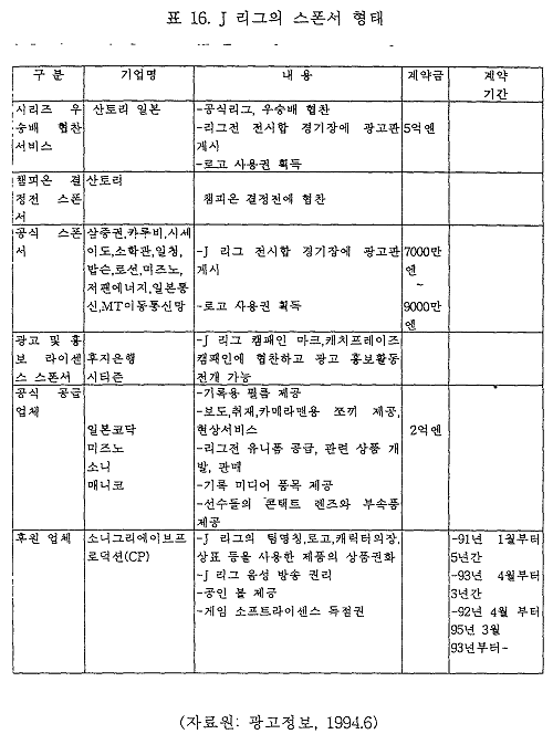 ÇöÀçJ ¸®±×¸¦ ÈÄ¿øÇÏ´Â ½ºÆù¼ÀÇ Á¾·ù´Â ¿©¼¸ Á¾·ù·Î ¨ç ½Ã¸®Áî ¿ì½Â¹è ÇùÂù ½ºÆù¼ ¨è èÇǿ°áÁ¤Àü ¿ì½Â¹èÇùÂù ½ºÆù¼ ¨é °ø½Ä ½ºÆù¼ ¨ê ±¤°í, È«º¸ ¶óÀ̼±½º ½ºÆù¼ ¨ë °ø½Ä °ø±Þ¾÷ü ¨ì ÈÄ¿ø¾÷ü µîÀÌ´Ù. ½Ã¸®Áî ¿ì½Â¹è ÇùÂù ½ºÆù¼ÀÎ »êÅ丮´Â ¿¬°£3¾ï5õ ¸¸¿£ÀÇ °è¾à·á¸¦ ³»°í Àü±â¿Í Èı⠰¢ 90°æ±âÀÇ ½ÃÇÕÀ» ÀÚ»çÀÇ À̸§À¸·Î Àü°³Çϰí ÀÖÀ¸¸ç Àü±â¿Í Èı⠿ì½ÂÆÀÀÌ °Ü·ç´Â èÇǿ °áÁ¤ÀüÀÇ ½ºÆù¼ À̱⵵ ÇÏ´Ù. °æ±âÀå¿¡ ±¤°íº¸µå(Board)°Ô½Ã, ·Î°í»ç¿ë µî¿¡ °üÇÑ °ø½Ä ½ºÆù¼´Â ´çÃÊ 8°³»ç¿¡¼ 94³âºÎÅÍ´Â 3°³»ç°¡ ´Ã¾î³ª 11°³»ç·Î ´Ã¾î³µÀ¸¸ç ÈÄ¹ß 3°³»çÀÇ ¿¬°£ °è¾à·á´Â Àü³â¿¡ ºñÇØ 2000¸¸¿£À̳ª ¶Ù¾î¿Ã¶ó J ¸®±×ÀÇ Àα⸦ ¹Ý¿µÇÏ¿´´Ù. J ¸®±×ÀÇ ±¤°í ¹× È«º¸¶óÀ̼¾¸¦ ȹµæÇÑ ±â¾÷Àº ÈÄÁöÀºÇà°ú ½ÃƼÁðÀ¸·Î J ¸®±× Ä·ÆÐÀθ¶Å©(campaign mark), ÄÍÆÐÀΠijġÇÁ·¹ÀÌÁî( campaign catch phrase)¸¦ »ç¿ëÇØ ±¤°í ¹× È«º¸È°µ¿¿¡ »ç¿ëÇϰí ÀÖ´Ù. ºÒ°æ±â¿¡¼µµ J ¸®±×ÀÇ ·Î°í³ª ÆÀÀÇ Ä³¸¯Å͸¦ »ç ¿ëÇÑ ¶óÀ̼¾½º »óǰÀº ȣȲÀ» ´©·È´Ù. »óÇ°È ±ÇÀ» µ¶Á¡Çϰí ÀÖ´Â ¼Ò´Ï-CP·ÎºÎÅÍ ¼ºê¶óÀ̼±½º¸¦ ÃëµæÇÑ ±â¾÷Àº ½Äǰ, ÀÇ·ù, ¹®¹æ±¸, »ýȰ ¿ëǰ µî ´Ù¾çÇÑ ¾÷Á¾¿¡¼ ÃÑ 41°³»çÀ̰í ÇöÀç(96³â3¿ù) °è¾àÀÌ ÁøÇàÁßÀÎ ±â¾÷ÀÌ 700¿©°³¿¡ µû¸¥´Ù(±¤°íÁ¤º¸,1996). J ¸®±× ¸¶Å© µîÀ» µðÀÚÀο¡ ÀÌ¿ëÇÑ ¼ºê¶óÀ̼±½º ¾÷üµéÀº 95³âµµ ¸ÅÃâÀÌ ¾à1,000¾ï¿£, ¼Ò´Ï CP°¡ J ¸®±× °øÀμ¥ ¡¸Äɵ¥°í¸®-l¡¹À» ÅëÇØ ÆÇ¸ÅÇϰí ÀÖ´Â ÀÀ¿ø»óǰ ¹× °ü·Ã»óǰÀÇ ¸ÅÃâ 300¾ï¿£À» ÇÕÇϸé 1,300¾ï¿£¿¡ ´ÞÇÑ´Ù.