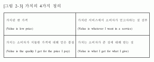 Áï °¡Ä¡´Â ¼ÒºñÀÚ°¡ ¼ºñ½º¸¦ ÅëÇØ ¾ò´Â °Í(get)°ú ±×°ÍÀ» À§ÇØ Á¦°øÇÏ´Â °Í(give) »çÀÌÀÇ »ó´ëÀû ±³È£°ü°è(trade-off)·Î ÆÄ¾ÇµÇ¸ç, ¼ÒºñÀÚ´Â °¡°Ýº¸´Ù »óÀ§ÀÇ °³³äÀÎ °¡Ä¡¿¡ ±Ù°ÅÇÏ¿© ±¸¸Å°áÁ¤À» ÇÑ´Ù.