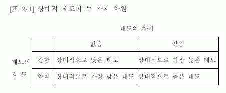 ÀÌ »ó´ëÀû ŵµ´Â ¿©·¯ ºê·£µå Áß¿¡¼ ƯÁ¤ ºê·£µå¸¦ ¹Ýº¹ÀûÀ¸·Î ±¸¸ÅÇϵµ·Ï ÇÏ´Â ¼Ó¼ºÀ» °®´Â´Ù. »ó´ëÀû ŵµ´Â ´ÙÀ½ÀÇ <Ç¥ 2-1>°ú °°ÀÌ ÅµµÀÇ °µµ(degree of attitudinal strength)¶ó´Â µÎ °¡Áö Â÷¿øÀ¸·Î ±¸¼ºµÈ´Ù.