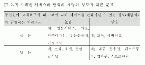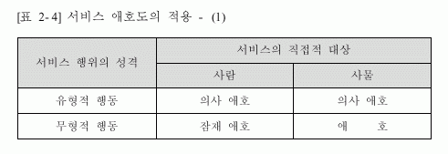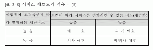»ç¹°¿¡ ´ëÇØ ¹«ÇüÀûÀÎ ¼ºñ½º¸¦ Á¦°øÇÏ´Â °æ¿ì¿¡´Â °í°´µéÀº ´ëüÀûÀ¸·Î ¾ÖÈ£ÇÏ´Â °æÇâÀ» ³ªÅ¸³½´Ù. ÀºÇà, ȸ°è»ç, º¯È£»ç µî ¹«Çü¼º°ú º¹À⼺ÀÇ Á¤µµ°¡ ³ô°í, ¼ºñ½º Á¦°øÀÚ¿¡ ´ëÇÑ ÀÇÁ¸µµ°¡ ³ôÀº ¼ºñ½º°¡ ÀÌ·¯ÇÑ °æ¿ì¿¡ ÇØ´çµÈ´Ù. À̰ÍÀº <Ç¥ 2-4>¿¡ ¿ä¾àµÇ¾î ³ªÅ¸³´Ù.