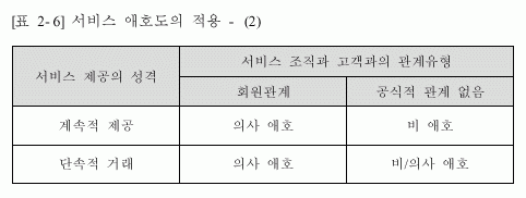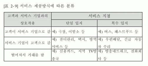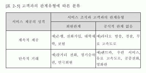 ¼ºñ½º ºÎ¹®¿¡¼´Â °³ÀÎÀ̳ª »ê¾÷¹Ýº¹±¸¸ÅÀÚ ¸ðµÎ°¡ ¼ºñ½º Á¦°øÀÚ¿Í Àå±âÀû °ü°è¸¦ ¸Î°í Áö¼ÓÀûÀ¸·Î ¼ºñ½º¸¦ ¹ÞÀ» ¼ö ÀÖ´Ù. ±×·¯¹Ç·Î ÀÌ ±âÁØ¿¡ µû¶ó ¼ºñ½º´Â ºÐ·ùµÈ´Ù. Áï ¼ºñ½º ±â¾÷ÀÌ ½Å¿ëÄ«µå, Àüȼºñ½º, ÇコŬ·´ µî°ú °°ÀÌ °í°´°ú ȸ¿øÁ¦ °ü°è¸¦ ¸Î´Â°¡? ¾Æ´Ï¸é °ø½ÄÀû °ü°è°¡ ¾ø´Â°¡? ¼ºñ½º°¡ °è¼ÓÀûÀ¸·Î Á¦°øµÇ´Â°¡ ¾Æ´Ï¸é °³º°ÀûÀ¸·Î °Å·¡µÇ´Â°¡? °¡ ºÐ·ùÀÇ ±âºÐÀÌ µÇ´Â °ÍÀÌ´Ù. ÀÌ·¯ÇÑ °ü°èÀÇ ºÐ·ù´Â <Ç¥ 2-5>¿¡ ±× ¿¹µéÀÌ Àß ³ªÅ¸³ª ÀÖ´Ù.
