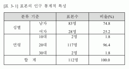 2°¡Áö ¼ºñ½º ¾÷Á¾¿¡ ´ëÇØ ÃÑ 140¸íÀÇ Á¶»ç ´ë»óÀÚ¿¡°Ô ¼³¹®Áö¸¦ ¹èÆ÷ÇÏ¿© 124ºÎ¸¦ ȸ¼öÇÏ¿´´Ù. ÀÌ Áß ÀÀ´äÀÇ ´©¶ô ¹× ºÒ¼º½ÇÇÑ ÀÀ´äÀ¸·Î ÀÎÇÑ 12ºÎ´Â ÀÚ·áÀÇ ºÐ¼®¿¡¼ Á¦¿ÜÇÏ¿´°í, ÃÑ 112ºÎ¸¦ ´ë»óÀ¸·Î ºÐ¼®À» ÁøÇàÇÏ¿´´Ù. Ç¥º»ÀÇ Àα¸ Åë°èÀû Ư¼ºÀº ´ÙÀ½ÀÇ <Ç¥ 3-1>¿¡ Á¤¸®µÇ¾ú´Ù.