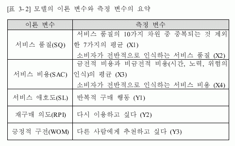 ÀÌ·Ð º¯¼ö´Â ¼ºñ½º ǰÁú, ¼ºñ½º ºñ¿ë, ¼ºñ½º ¾ÖÈ£µµ, À籸¸Å Àǵµ, ±àÁ¤Àû ±¸ÀüÀÇ 5°¡Áö·Î ³ª´©¾îÁø´Ù. À̵é ÀÌ·Ð º¯¼ö¿¡ ´ëÇÑ ÃøÁ¤ º¯¼ö´Â ±âÁ¸ÀÇ ¼±Çà ¿¬±¸¿¡¼ »ç¿ëÇÑ Ç׸ñµéÀ» »ç¿ëÇÏ¿´´Ù.