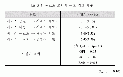 ¼ºñ½º ¾ÖÈ£µµ¿Í À籸¸Å Àǵµ, ±¸Àü°úÀÇ °ü°è¸¦ ºÐ¼®Çϱâ À§Çؼ´Â ÃøÁ¤ º¯¼öµéÀÇ Cronbach's Alpha °è¼ö¸¦ È®ÀÎÇÏ¿´´Ù. ÀÌ·Ð º¯¼ö´Â 5°¡ÁöÀÌÁö¸¸ ¼ºñ½º ¾ÖÈ£µµ, À籸¸Å Àǵµ, ±¸Àü µîÀÇ ¼¼ °¡Áö´Â ÇÑ °¡Áö ÃøÁ¤ º¯¼ö¸¸À» »ç¿ëÇÏ¿´À¸¹Ç·Î ¼ºñ½º ÇýÅðú ¼ºñ½º ºñ¿ë µÎ °¡Áö¿¡ ´ëÇØ ½Å·Ú¼º °è¼ö¸¦ ÃøÁ¤ÇÏ¿´´Ù.