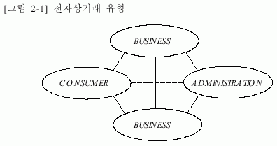 ESPRIT(1996)¿¡¼´Â Á¤º¸±³È¯ÀÇ ÁÖü¿¡ µû¶ó ÀüÀÚ»ó°Å·¡¸¦ ±â¾÷°£(business to business), ±â¾÷°ú °³ÀÎ(business to consumer), ±â¾÷°ú Á¤ºÎ(business to administration), °³Àΰú Á¤ºÎ(consumer to adminstration)ÀÇ ³×°¡Áö·Î <±×¸² 2-1>°ú °°ÀÌ ºÐ·ùÇÑ´Ù.5)