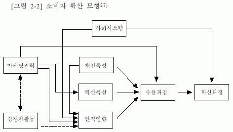 Çõ½ÅÀÇ È®»ê(diffusion of innovation)¿¡ ´ëÇÑ ¿¬±¸´Â Á¦Ç°¿¡ ´ëÇÑ ¼ÒºñÀÚÀÇ ¼ö¿ëÀÌ Àüü½ÃÀå¿¡¼ ¾î¶»°Ô ÆÄ±ÞµÇ´Â°¡¸¦ ¾Ë ¼ö ÀÖ°Ô ÇØÁÖ¸ç <±×¸² 2-2>¿Í °°ÀÌ ¸ðÇüÈ ÇÒ ¼ö ÀÖ´Ù. ÀÌ ¸ðÇü¿¡ ÀÇÇϸé, Çõ½ÅÀÇ È®»êÀº »çȸ½Ã½ºÅÛÀ̳ª ½ÃÀå ³»¿¡¼ ÀÌ·ç¾îÁö¸ç, °³º°¼ÒºñÀÚµéÀÇ ¼ö¿ë¿¡ ÀÇÇØ¼ Á¿ìµÈ´Ù. °³º°¼ÒºñÀÚÀÇ ¼ö¿ë°úÁ¤Àº Çõ½ÅÀ» ¹Þ¾ÆµéÀÏ ¶§ °ÅÄ¡´Â Á¤½ÅÀû °úÁ¤À¸·Î¼ ¼ö¿ë°áÁ¤Àº Çõ½ÅƯ¼º, °³ÀÎÆ¯¼º, ÀÎÀû ¿µÇâ ¹× ¸¶ÄÉÆÃ ³ë·Â¿¡ ÀÇÇØ¼ ¿µÇâÀ» ¹Þ´Â´Ù.