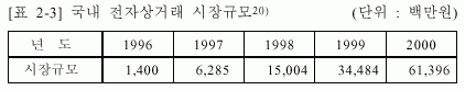 »ï¼º°æÁ¦¿¬±¸¼Ò´Â '»ê¾÷Áöµµ¸¦ ¹Ù²Ù´Â ÀÎÅÍ³Ý ºñÁî´Ï½º'¶ó´Â º¸°í¼¿¡¼ 1999³â 6¹é¾ï¿ø ±Ô¸ðÀÎ ±¹³» ÀüÀÚ»ó°Å·¡ ½ÃÀåÀÌ 2005³â±îÁö ¿¬°£ 200% ÀÌ»óÀÇ Ãʰí¼Ó ¼ºÀåÀ» °ÅµìÇÒ °ÍÀ¸·Î ¿¹»óÇß´Ù. <Ç¥ 2-3>¿¡¼µµ º¸µíÀÌ ÀÎÅͳÝÀ» ÅëÇÑ ÀüÀÚ»ó°Å·¡ ½ÃÀå ±Ô¸ð´Â 97³â 63¾ïÀ¸·Î 2000³â¿¡´Â 614¾ïÀ¸·Î Áõ°¡µÇ¸®¶ó ¿¹»óµÈ´Ù. Ãʱ⠴ܰèÀ̹ǷΠ½ÃÀå±Ô¸ð°¡ ¹ÌºñÇÑ ½ÇÁ¤À̳ª ¼¼°èÀû Ãß¼¼¿Í ¸¶Âù°¡Áö·Î ÇâÈÄ Å©°Ô Áõ°¡ÇÒ Àü¸ÁÀÌ´Ù.