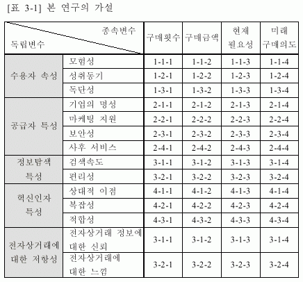 ¼ö¿ëÀÚÀÇ ¼Ó¼ºº¯¼ö°¡ Çõ½Å¼ö¿ë°ú ¼ö¿ë¼Óµµ¿¡ µ¶¸³ÀûÀ¸·Î ¿µÇâÀ» ¹ÌÄ£´Ù´Â °¡Á¤ÇÏ¿¡¼ °ø±ÞÀÚÆ¯¼º º¯¼ö, Á¤º¸Å½»öƯ¼º º¯¼ö, Çõ½ÅÀÎÁöƯ¼º º¯¼ö, ÀüÀÚ»ó°Å·¡¿¡ ´ëÇÑ ÀúÇ×¼º º¯¼ö¿Í ÀüÀÚ»ó°Å·¡»óÀÇ ±¸¸ÅÇൿ°úÀÇ °ü°è¸¦ ±Ô¸íÇØ º¸°íÀÚÇÏ¸ç ´ÙÀ½°ú °°Àº °¡¼³À» ¼³Á¤ÇÏ¿´´Ù.