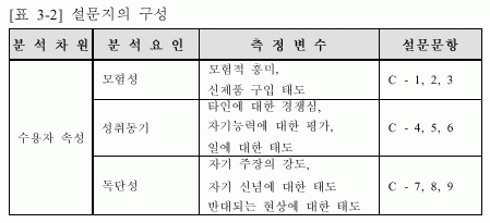Çõ½Å ¼ö¿ë¿¡ ´ëÇÑ º¯¼ö ¼³Á¤Àº ¿¬±¸Àڵ鸶´Ù Â÷À̰¡ ÀÖÀ¸³ª °¢°¢ÀÇ º¯¼öµéÀº ¿¬±¸ÀÇ °üÁ¡°ú ¸ñÀû¿¡ ¸Â°Ô ÀçÁ¤ÀÇ ÇÏ¿´°í, ¼¼ºÎ ¿äÀεéÀÇ Ç¥ÇöÀº Rogers(1983)¿Í Ram(1987), ±×¸®°í Robertson°ú Gatignon(1986)µîÀÇ °¢Á¾ ¿¬±¸¸¦ ±âÃʷΠǥÇöÇÏ¿´´Ù. °¢ º¯¼öµé¿¡ ´ëÇÑ Á¶ÀÛÀû Á¤ÀÇ´Â ´ÙÀ½°ú °°´Ù.