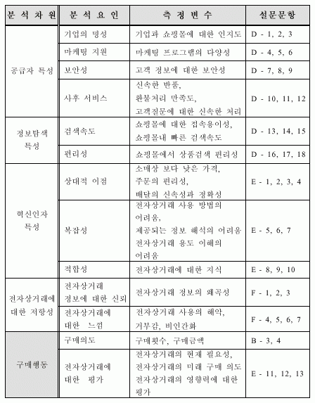 Çõ½ÅÀÎÀÚ Æ¯¼º º¯¼ö´Â RogersÀÇ Çõ½Å ¼Ó¼ºº¯¼ö¸¦ ±×´ë·Î ÀÌ¿ëÇÏ¿´´Ù. '»ó´ëÀû ÀÌÁ¡'Àº ±âÁ¸ °Å·¡¿Í ºñ±³ÇÏ¿´À» ¶§ ÀüÀÚ»ó°Å·¡°¡ Áö´Ò ¼ö ÀÖ´Â ºñ±³ ¿ìÀ§ÀûÀÎ ÀåÁ¡µé·Î ÀÏ¹Ý ¼Ò¸Å»óº¸´Ù ³·Àº °¡°Ý, ÁÖ¹®ÀÇ Æí¸®¼º, ¹è´ÞÀÇ ½Å¼Ó¼º, ¹è´ÞÀÇ Á¤È®¼ºÀ¸·Î Á¤ÀÇÇÏ¿´´Ù. 'º¹À⼺'Àº ÀüÀÚ»ó°Å·¡ »ç¿ë½Ã »ç¿ë¹æ¹ýÀÇ ¾î·Á¿ò°ú Á¤º¸Çؼ®ÀÇ ¾î·Á¿ò ±×¸®°í ÀüÀÚ»ó°Å·¡ ¿ëµµ ÀÌÇØÀÇ ¾î·Á¿ò µîÀÇ Á¤µµ·Î Á¤ÀÇÇÏ¿´´Ù. 'ÀûÇÕ¼º'Àº ÀüÀÚ»ó°Å·¡ »ç¿ëÀÚÀÇ ½É¸®Àû ¼ºÇâÀ̳ª ¾÷¹«ÀÇ Çʿ伺¿¡ ¾ó¸¶³ª ÇÕÄ¡µÇ´À³ÄÇÏ´Â °ÍÀ¸·Î¼ Á¤ÀÇÇÏ¿´´Âµ¥ ÀÌ´Â ÀüÀÚ»ó°Å·¡¿¡ ´ëÇÑ ±âº»ÀûÀÎ ±â´ÉÀû, ½É¸®Àû Çʿ伺À» ÃøÁ¤Çϱâ À§ÇÔÀÌ´Ù.