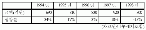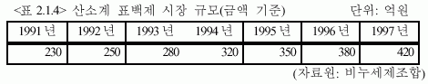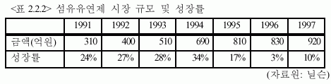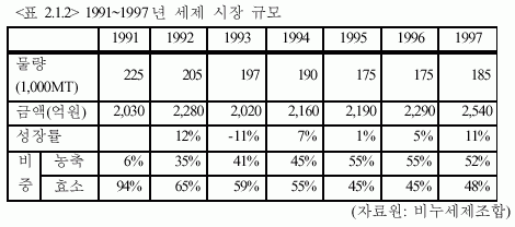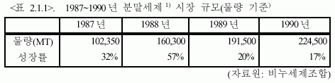ÇÇÁÔ¿¡ ÀÇÇØ °³¹ßµÈ ½ÃÀåÀº ±× ±Ô¸ð°¡ Ä¿Áö°í, ¼ºÀå·üÀÌ ³ô¾ÆÁö¸é¼ ¼¼Á¦ Á¦Á¶¾÷üµéÀÌ ½ÃÀå¿¡ Âü¿©ÇÏ°í ¸¶ÄÉÆÃ ºñ¿ëÀÌ ÅõÀÔµÇ¸é¼ ¼ºÀåÀÌ °¡¼ÓȵǾú´Ù. 1991³âºÎÅÍ 1997³â±îÁöÀÇ ½ÃÀå ±Ô¸ð¸¦ »ìÆìº¸¸é <Ç¥2.2.2>¿Í °°´Ù.