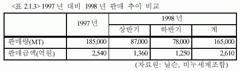 ±×·¯³ª ¿Üȯ À§±â·Î ÀÎÇÑ È¯À²ÀÇ ÆøµîÀº ¿øÀÚÀç °¡°ÝÀÇ ÆøµîÀ¸·Î À̾îÁ® ¼¼Á¦ °¡°ÝÀÌ 20% ÀÌ»ó ´ëÆø ÀλóµÇ¾ú´Ù. ¼¼Á¦ °¡°ÝÀÇ ÀλóÀº ¼Òºñ ¾ïÁ¦¸¦ ´õ¿í ºÎÃß°Ü °á°úÀûÀ¸·Î 1998³âÀÇ ÆÇ¸Å·®À» 1997³âº¸´Ù 11% ÁÙ¾îµç 165,000Åæ¿¡ ¸Ó¹°°Ô ÇÏ¿´´Ù.