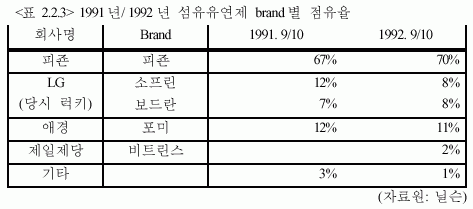 ¼ºÀå±â¿´´ø 1992³â ½ÃÀåÀÇ °æÀï »óȲÀ» »ìÆìº¸¸é Ç¥2.2.3°ú °°ÀÌ ÇÇÁÔÀÌ 70% Á¡À¯À²À», ±× ¿Ü ºê·£µå°¡ 30%¸¦ Ä¡ÁöÇϰí ÀÖ´Â ÇÇÁÔÀÇ µ¶Á¡ ½ÃÀåÀ̾ú´Ù. LG(´ç½Ã ·°Å°)´Â ¼ÒÇÁ¸°°ú º¸µå¶õÀÇ 2°³ ºê·£µå¸¦ ¿î¿µÇϰí ÀÖ¾úÀ¸³ª ½ÃÀåÀÇ 16%¸¦ Â÷ÁöÇϰí ÀÖ¾ú´Ù. ±×·¯³ª ÀÌ µÎ Á¦Ç°ÀÇ ÄÁ¼ÁÀÌ À¯¿¬·Â¿¡ ÇÑÁ¤µÇ¾î ÀÖ¾î ÇÇÁÔÀÇ ¾Æ·ù·Î ÀÎ½ÄµÇ¾î °¡°Ý °ø¼¼·Î ¸ÅÃâÀ» À¯ÁöÇÏ´Â »óȲÀ̾ú´Ù. ¶ÇÇÑ ¼ÒºñÀÚµµ ÀÌ Á¦Ç°À» Àú°¡ Á¦Ç°À¸·Î ÀνÄÇϰí ÀÖ¾ú´Ù.(HRC, 1991) ½ÃÀåÀº ¼ºÀåÇßÁö¸¸ Á¡À¯À²Àº ÁÙ¾îµé°í ÀÖ¾ú±â ¶§¹®¿¡ LG´Â Àû±ØÀûÀÎ ½ÃÀå °ø¼¼¸¦ À§ÇÏ¿© 1993³â ½Å±Ô ºê·£µå »þÇÁ¶õÀ» ·±ÄªÇÏ¿´´Ù.