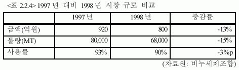 »ê¼Ò°è Ç¥¹éÁ¦ ½ÃÀå¿¡ ´ëÇÑ ºÒȲÀÇ ¿µÇâÀº ¼¼Å¹¼¼Á¦º¸´Ù ÈξÀ Á÷Á¢ÀûÀ̾ú´Ù. »ç¿ë·üÀÌ 1997³âÀÇ 90%¿¡¼ 1998³â¿¡´Â 83%·Î ÁÙ¾ú´Ù.(SOFRES, 1998) ÆÇ¸Å±Ý¾×Àº 1997³âÀÇ 420¾ï¿ø¿¡¼ 390¾ï¿øÀ¸·Î 12%°¡ °¨¼ÒÇÏ¿´À¸¸ç, ÆÇ¸Å·®Àº 19,200Åæ¿¡¼ 15,200ÅæÀ¸·Î 17%°¡ °¨¼ÒÇÏ¿´´Ù.(ºñ´©¼¼Á¦Á¶ÇÕ, ´Ò½¼)