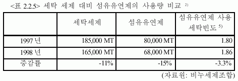 ±×·¯³ª ¼¼Å¹ ¼¼Á¦´Â ´ë´Ù¼ö ¼ÒºñÀÚ°¡ ÇʼöǰÀ¸·Î ÀνÄÇϰí ÀÖ¾î »ç¿ë·®À» ÁÙÀ̰í, ¼¼Å¹ ȸ¼ö¸¦ ÁÙÀÌ´Â ¼Ò±ØÀû ¼Òºñ Àý¾àÀÇ ÇàŸ¦ º¸¿´±â ¶§¹®¿¡ ÆÇ¸Å ±Ý¾×¸é¿¡¼´Â ÁÙ¾îµéÁö ¾Ê¾Ò´Ù. ¼ÒºñÀÚÀÇ ±¸¸Å ¼ºÇâÀÌ Àú°¡°Ý ÁöÇâÀ» º¸ÀÌÀÚ 1998³â ÇϹݱâºÎÅÍ °¢ ¾÷ü¿¡¼´Â ¾Õ´ÙÅõ¾î ÆÇÃ˰ú °¡°Ý ÇÒÀÎ µîÀ» ÁýÁßÇÏ¿© 1999³â 1¿ùÀÇ ¼¼Á¦ kg´ç ÆÇ¸Å °¡°ÝÀº 2,163¿øÀ¸·Î, 1998³â 3¿ùÀÇ 2,377¿øº¸´Ù 9%³ª ³·¾ÆÁ³´Ù.