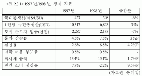 1998³â ÇÑÇØ´Â ¿ì¸® »çȸ¿¡ Ä¿´Ù¶õ º¯È°¡ ÀÖ¾ú´ø ÇÑÇØ·Î, ƯÈ÷ °æÁ¦ ȯ°æ¿¡´Â ¾öû³ º¯È°¡ ÀÖ¾ú´Ù. »ê¾÷È ÀÌÈÄ ÃÖÃÊÀÇ ¸¶À̳ʽº ¼ºÀå°ú µÎÀÚ¸®¼ö ½Ç¾÷·ü, ´Þ¸¶´Ù °æ½ÅµÇ´Â ºÎµµÀ² µî ±Ùº»ÀûÀÎ »ê¾÷ ±â¹Ý Àüü°¡ À§±â¿¡ óÇß¾ú´Ù. 1998³âÀÇ °æÁ¦ ÁöÇ¥¸¦ Á¤¸®Çϸé <Ç¥ 2.3.1>°ú °°´Ù.