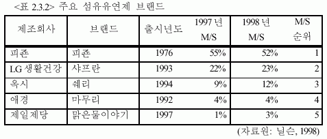 ÇöÀç ½ÃÀå¿¡¼ °æÀïÇϰí ÀÖ´Â ¼¶À¯À¯¿¬Á¦´Â 20¿©°³ÀÇ ºê·£µå°¡ Á¸ÀçÇÏÁö¸¸ º» ³í¹®¿¡¼´Â 1998³â M/S 3% ÀÌ»óÀÌ¸ç ½ÃÀå ÀáÀç·ÂÀÌ ÀÖ´Â ÁÖ¿ä 5°³ ºê·£µå¸¦ Áß½ÉÀ¸·Î Á¤¸®ÇϰڴÙ. ÁÖ¿ä 5°³ ºê·£µåÀÇ Á¦Á¶»ç¿Í ºê·£µå, ½ÃÀå Á¡À¯À²À» Á¤¸®Çϸé <Ç¥2.3.2>¿Í °°´Ù.