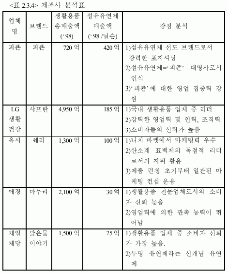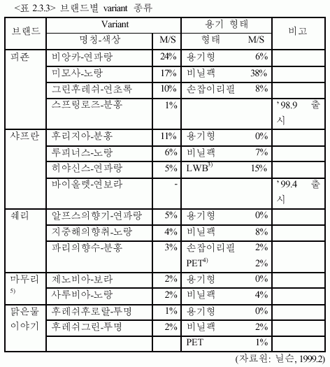 ¼¶À¯À¯¿¬Á¦ ½ÃÀåÀÌ ¿©Å¸ ¼¼Å¹¿ëǰ°ú ´Ù¸¥ Ư¡Àº Á¦Ç°ÀÇ ±Ô°Ý°ú ¿ë±â ŸÀÔÀÌ ¸Å¿ì ´Ù¾çÇÏ´Ù´Â Á¡ÀÌ´Ù. °¢ ºê·£µå¸¶´Ù »ö»ó°ú Çâ¿¡ µû¸¥ variant°¡ 2°³ ÀÌ»ó¾¿ÀÌ ÀÖÀ¸¸ç, ¼ÒºñÀÚÀÇ ´ÏÁîµµ ¸Å¿ì ´Ù¾çÇÏ´Ù. ¶ÇÇÑ ºÐ¸» Á¦Ç°µéÀÌ ¿ë±â¿Í ºñ´ÒÆÑ µÎ Á¦Ç°Àε¥ ¹ÝÇØ ¾×ü Á¦Ç°ÀÇ Æ¯¼º»ó ¿ë±â¿¡ ´ëÇÑ ´ÏÁî°¡ ´Ù¾çÇÏ¿© ±× Á¾·ù°¡ ¸¹´Ù. °¢ ºê·£µåº° »ö»ó°ú Çâ¸í, ¿ë±â ÇüŸ¦ ºÐ·ùÇÏ¿© Á¤¸®Çϸé <Ç¥2.3.3>°ú °°´Ù.