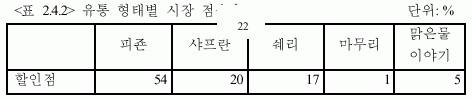 ÇÒÀÎÁ¡¿¡¼´Â ÆÇÃË Çà»ç°¡ Àû°í ´ëÀÎ ÆÇ¸Å°¡ ¸¹Áö ¾Ê¾Æ ¼ÒºñÀÚÀÇ µ¶ÀÚÀûÀÎ ÀÇ»ç °áÁ¤ÀÌ Áß½ÉÀÌ µÈ´Ù. ÀÌÀÇ ½ÃÀåÁ¡À¯À²À» »ìÆìº¸¸é <Ç¥2.4.2>¿Í °°´Ù.
