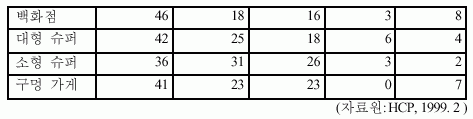 ±¹³» À¯Åë ÇöÀåµµ Á¡Â÷ ¼¼ºÐȵǾ°í, ºÒȲÀ¸·Î À¯Åë ±¸Á¶µµ ±Þº¯ÇÏ¿´´Ù. ºÒȲÀ¸·Î ÀÎÇØ ÇÒÀÎÁ¡À» ÀÌ¿ëÇÏ´Â ¼ÒºñÀÚÀÇ ¼ö°¡ ´Ã¾ú°í, »ýȰ¿ëǰÀÇ ÇÒÀÎÁ¡ ±¸¸Å ºñÁßµµ Á¡Â÷ Ä¿Á³´Ù. ¼¶À¯À¯¿¬Á¦ÀÇ ±¸ÀÔ Àå¼Ò´Â ÇÒÀÎÁ¡ÀÌ 23%, ´ëÇü ½´ÆÛ°¡ 30%, ¼ÒÇü ½´ÆÛ°¡ 10%, ³óÃà¼öÇùÀÌ 13%, ¹éÈÁ¡ÀÌ 9%, ±¸¸Û°¡°Ô°¡ 9%, ±×¸®°í ±âŸ°¡ 10%¿´´Ù.(ÀÚ·á¿ø: HCP, 1999.2)