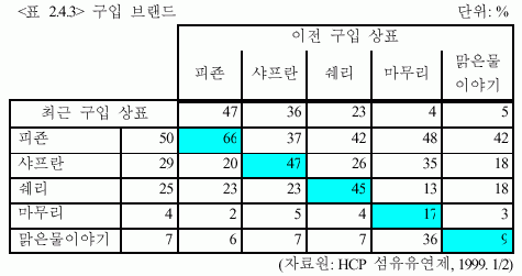 ¼ÒºñÀÚ ±¸ÀÔÀÚº° ÀÌÀü ±¸ÀÔ ºê·£µå¿Í ÇöÀç ±¸ÀÔ ºê·£µå¸¦ º¸¸é <Ç¥ 2.4.3>°ú °°´Ù. ÁÖ¿ä ºê·£µåÀÇ À籸¸ÅÀ²Àº ÇÇÁÔÀÌ 52%, »þÇÁ¶õÀÌ 40%, ½¦¸®°¡ 36%, ¸¼Àº¹°À̾߱Ⱑ 25%ÀÌ´Ù.