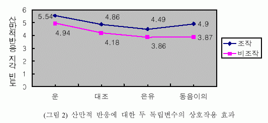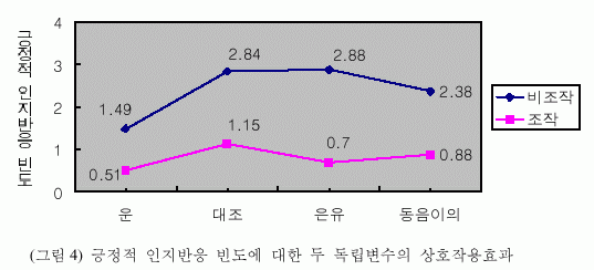 ±×¸²3ÀÇ »óÈ£ÀÛ¿ë È¿°ú¸¦ º¸¸é '¿î'ÀÇ À¯ÇüÀº Á¶ÀÛ±¤°í¿¡¼ ºñÁ¶ÀÛ ±¤°íº¸´Ù ÀÎÁö¹ÝÀÀÀ» ´õ ³ô°Ô ³ªÅ¸³ª¸ç ³ª¸ÓÁö ´Ù¸¥ 3°¡Áö ½Ã°¢Àû À¯ÇüÀº ¸ðµÎ ºñÁ¶ÀÛ ±¤°í¿¡¼ ³ôÀº ÀÎÁö¹ÝÀÀÀ» ³ªÅ¸³ °ÍÀÌ Æ¯Â¡ÀûÀÌ´Ù. Áï, ½Ã°¢Àû ¼ö»ç±¤°í°¡ ºñ¼ö»ç ±¤°íº¸´Ù ÀÎÁö¹ÝÀÀÀÌ ´õ ¸¹ÀÌ À¯¹ßÇÏ¿´´Ù. ¹Ý¸é, ½Ã°¢Àû À¯Çü¿¡ À־ ºñ¼ö»ç ±¤°í¿¡¼ '¿î'¿¡ Çü½ÄÀÌ, ½Ã°¢Àû ¼ö»ç±¤°í¿¡¼ 'ÀºÀ¯'¿Í 'µ¿À½ÀÌÀÇ' Çü½ÄÀÌ ´õ ¸¹ÀÌ À¯¹ßÇϸç, '´ëÁ¶'ÀÇ °æ¿ì´Â Â÷À̰¡ ¾ø¾ú´Ù.