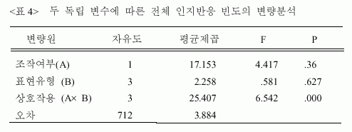 Àüü ÀÎÁö¹ÝÀÀ ºóµµÀÇ º¯·®ºÐ¼® °á°ú ½Ã°¢Àû ¼ö»ç Á¶ÀÛ¿©ºÎ¿¡ µû¸¥ ÁÖÈ¿°ú¿Í ºñÁ¶ÀÛ ±¤°í(M=3.28, SD=1.98)°¡ Á¶ÀÛ ±¤°í(M=2.98, SD=2.00)º¸´Ù ³ôÀº ÀÎÁö¹ÝÀÀÀ» À¯¹ßÇÏ¿´´Ù.