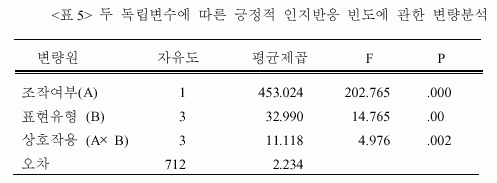 ´ÙÀ½À¸·Î ½Ã°¢Àû Ç¥ÇöÀ¯Çü¿¡¼´Â '¿î' À¯Çü(M=5.24, SD=1.32)ÀÌ '´ëÁ¶'(M=4.52, SD=1.22) 'ÀºÀ¯'(M=4.19, SD=1.29) ¹× 'µ¿À½ÀÌÀÇ'(M=4.37, SD=1.47) À¯Çüº¸´Ù Schffe »çÈİËÁõ °á°ú p.05¼öÁØ¿¡¼ »ê¸¸ÇÏ´Ù´Â ¹ÝÀÀÀ» º¸¿´´Ù.