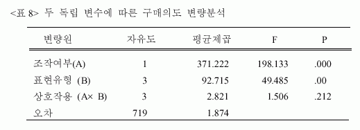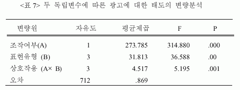 ½Ã°¢Àû¼ö»ç Á¶ÀÛ¿©ºÎ¿Í Ç¥ÇöÀ¯Çü¿¡ µû¸¥ ±¤°í¿¡ ´ëÇÑ Åµµ(Aad)ÀÇ º¯·®ºÐ¼® °á°ú´Â Ç¥7°ú °°´Ù.