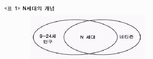 ´Ù½Ã ¸»Çؼ, X¼¼´ë(1965³â¿¡¼ 1978³â »çÀÌ¿¡ Ãâ»ý)¿Í Y¼¼´ë(1318¼¼´ë·Î 2000³âÀ» ÁÖµµÇÒ ¼¼´ë)°¡ ¿¬·É¿¡ ÀÇÇØ ÀÚ¿¬½º·´°Ô ¹ú¾îÁö´Â ¹®ÈÀû, °¨¼ºÀû Â÷À̸¦ µÎ°í ±¸ºÐÇÑ ¼ÒºñÀÚ ±×·ìÀ̶ó¸é N¼¼´ë´Â ÄÄÇ»ÅÍ, ÀÎÅͳÝ, PCÅë½Å, ³×Æ®¿öÅ©, À̵¿Åë½Å°ú °ü·ÃÇÏ¿© ¹ß»ýÇÏ´Â ¶óÀÌÇÁ½ºÅ¸ÀÏÀ» Á÷Á¢ÀûÀ¸·Î Ç¥ÇöÇÏ´Â »õ·Î¿î ¼ÒºñÀÚ Áý´ÜÀ̶ó°í ÇÒ ¼ö ÀÖ´Ù. Áï X¼¼´ë°¡ MTV·Î ´ëÇ¥µÇ´Â '¿µ»ó¸Åü'¸¦ Áß½ÉÀ¸·Î ¼ºÀåÇÑ ¼¼´ë¶ó°í ÇÑ´Ù¸é N¼¼´ë´Â ÀÎÅͳݰú ¿Â¶óÀÎ Åë½Å¸ÁÀ» ÁÖ¿ä ¸Åü·Î »ç¿ëÇϱ⠶§¹®¿¡ PC³ª ÈÞ´ëÆùÀ» ÀÌ¿ëÇÑ 'Á¢¼Ó'À» Áß¿ä½ÃÇÏ´Â ³×Æ®¿öÅ© ¼¼´ë¶ó°í ÇÒ ¼ö ÀÖ´Ù.