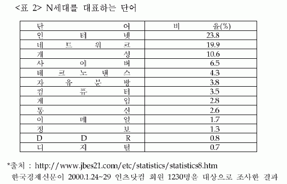 N¼¼´ë°¡ »çȸÀûÀ¸·Î ÁÖ¸ñÀ» ¹Þ´Â °ÍÀº 21¼¼±â µé¾î¿Í¼ ±× ÀÚü·Î ÇϳªÀÇ °Å´ëÇÑ »çȸÀû È帧À» Çü¼ºÇϰí Àֱ⠶§¹®ÀÌ´Ù. ¼¿ï YWCA°¡ 1999³â 9¿ù Áß, °í±³»ý 1200¸íÀ» ´ë»óÀ¸·Î ½Ç½ÃÇÑ ÀǽÄÁ¶»ç °á°ú¿¡ µû¸£¸é 43.9%°¡ ÀÚ½ÅÀ», X, Y, Z, N¼¼´ë Áß '¾î´À ¼¼´ë¿¡µµ ¼ÓÇÏÁö ¾Ê´Â´Ù'¿¡ ÀÀ´äÇÏ¿´°í ´ÜÁö 26.8%°¡ ÀÚ½ÅÀ» N¼¼´ë¶ó°í ÀÀ´äÇÏ¿´´Âµ¥ 'Åë½ÅÀ̳ª ÀÎÅͳÝÀ» ÅëÇØ ¸ðµç ¹®È¸¦ ¼ö¿ëÇÑ´Ù' 'µðÁöÅÐ ¹®¸í¿¡ Àͼ÷ÇÏ´Ù'¶ó´Â °ÍÀÌ ±×µéÀÌ N¼¼´ë¶ó°í »ý°¢ÇÏ´Â ÀÀ´ä ÀÌÀ¯¿´´Ù.7) ±×·¯³ª ºÒ°ú 5°³¿ùÀÌ Áö³ 2000³â 3¿ù¿¡ ½Ç½ÃÇÑ "N¼¼´ë °¡Ä¡°ü¿¡ ´ëÇÑ ÅµµÁ¶»ç"¸¦ »ìÆìº¸¸é ¹«·Á 79%(°íµîÇлý 88%, ÁßÇлý 87%, ´ëÇлý 61%)°¡ ÀÚ½ÅÀÌ N¼¼´ë¶ó°í »ý°¢ÇÏ´Â °ÍÀ¸·Î ³ªÅ¸³µ´Ù. ÀÌµé ½º½º·ÎÀÇ N¼¼´ë¿¡ ´ëÇÑ Àνĵµ ªÀº ½Ã°£¿¡ ¾öû³ º¯È¸¦ °¡Á®¿Â °ÍÀ» ¾Ë ¼ö ÀÖ´Ù. ±×°ÍÀº N¼¼´ë°¡ »çȸÀû À̽´·Î ´ëµÎµÇ¸é¼ ´º½º³ª ½Å¹®±â»ç µî ´ëÁ߸Åü¸¦ ÅëÇØ N¼¼´ëÀÇ °³³äÀÌ ÀÏ¹Ý »ç¶÷µé¿¡°Ô ÀüÆÄµÈ ¿µÇâÀÎ °ÍÀ¸·Î »ý°¢µÈ´Ù.