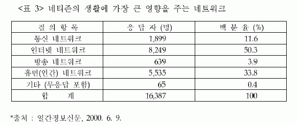 ¶ÇÇÑ, ³×ƼÁðÀ» ´ë»óÀ¸·Î ÇÑ ³×Æ®¿öÅ© °ü·Ã ¼³¹®Á¶»ç °á°ú9)¿¡ ÀÇÇÏ¸é »ýȰ¿¡ °¡Àå Å« ¿µÇâÀ» ¹ÌÄ¡´Â ³×Æ®¿öÅ©10)¸¦ ¹¯´Â Áú¹®¿¡ ÀÀ´äÀÚÀÇ 50.3%°¡ ÀÎÅÍ³Ý ³×Æ®¿öÅ©¶ó°í ´äÇØ '»ç¶÷ÀÌ ¾Æ´Ï¶ó ÀÎÅͳÝ'À̶ó´Â Èï¹ÌÀÖ´Â °á°ú°¡ ³ª¿Ô´Ù.