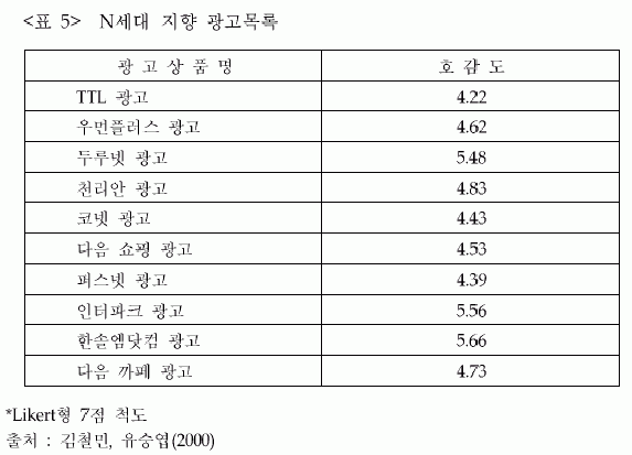 ±âŸ äÆÃ¾ð¾îÀÇ Æ¯¼ºÀÌ ³ªÅ¸³ ±¤°í´Â ¼Ò¸®³ª´Â ´ë·Î ¾²±â, Ãà¾àÇÏ¿© ¾²±â µîÀÇ ÇüŰ¡ ³ªÅ¸³ª´Âµ¥ äÆÃ¾ð¾îÀÇ È®»êÀº ÀÌó·³ ±¤°í¾ð¾î¿¡±îÁö ³Î¸® ¿µÇâÀ» ³¢Ä¡°í ÀÖÀ½À» ¾Ë ¼ö ÀÖ´Ù. ¶ÇÇÑ Ã¤ÆÃ¾ð¾î¸¦ Ȱ¿ëÇÑ ±¤°í°¡ äÆÃ¿¡ Àͼ÷ÇÑ N¼¼´ëµé¿¡°Ô ´Ù¸¥ ±¤°íµé¿¡ ºñÇØ Ä£±Ùµµ³ª È£°¨µµ°¡ ³ôÀ» °ÍÀ̶ó´Â ¿¹ÃøÀÌ °¡´ÉÇѵ¥ ½ÇÁ¦·Î ±èö¹Î, À¯½Â¿±(2000)Àº 100ÆíÀÇ N¼¼´ë ÁöÇâ ±¤°í¹° Áß¿¡¼ ½ÇÇèÀ» ÅëÇØ ÃÖÁ¾À¸·Î N¼¼´ë¿¡°Ô È£°¨µµ°¡ ÀÖ´Â »óÀ§ 10ÆíÀÇ ±¤°í¸¦ ¼±Á¤ÇÏ¿´´Âµ¥ ±× ¸ñ·ÏÀ» º¸¸é ¾Õ¼ ¾ð±ÞÇÑ ÄÚ³Ý ±¤°í, ´ÙÀ½±îÆä ±¤°í, ÀÎÅÍÆÄÅ© ±¤°í, ÆÛ½º³Ý ±¤°í µî äÆÃ¾ð¾î¸¦ Ȱ¿ëÇÑ ±¤°í°¡ 4ÆíÀ̳ª ·©Å©µÇ¾î ÀÖ°í È£°¨µµ¿¡¼µµ ³ôÀº Á¡¼ö¸¦ ȹµæÇϰí ÀÖÀ½À» ¾Ë ¼ö ÀÖ´Ù.