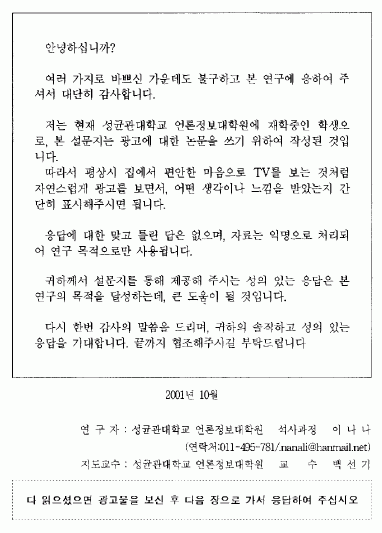 ±¤°í¿¡ ´ëÇÑ ¿©·¯ºÐÀÇ Áï°¢ÀûÀÎ ´À³¦ÀÌ °¡Á¤ Áß¿äÇϹǷΠ³Ê¹« ¿À·¡ »ý°¢Çϰųª ¸Ó¹µ°Å¸®Áö¸»°í ºü¸£°Ô ÀÀ´äÇØ ÁÖ¼¼¿ä.